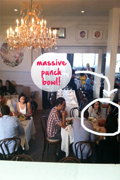 And speaking of parties, at around 1 p.m., Bagatelle became crazy full with hip patrons and punch bowls. The bar at top was even packed, and as much as I wondered why the somewhat sheer curtains had been drawn all morning, I finally understood. We were surrounded by hair-of-the-dog seeking familiar faces looking for a good time and a hangover cure…looks like they found it.