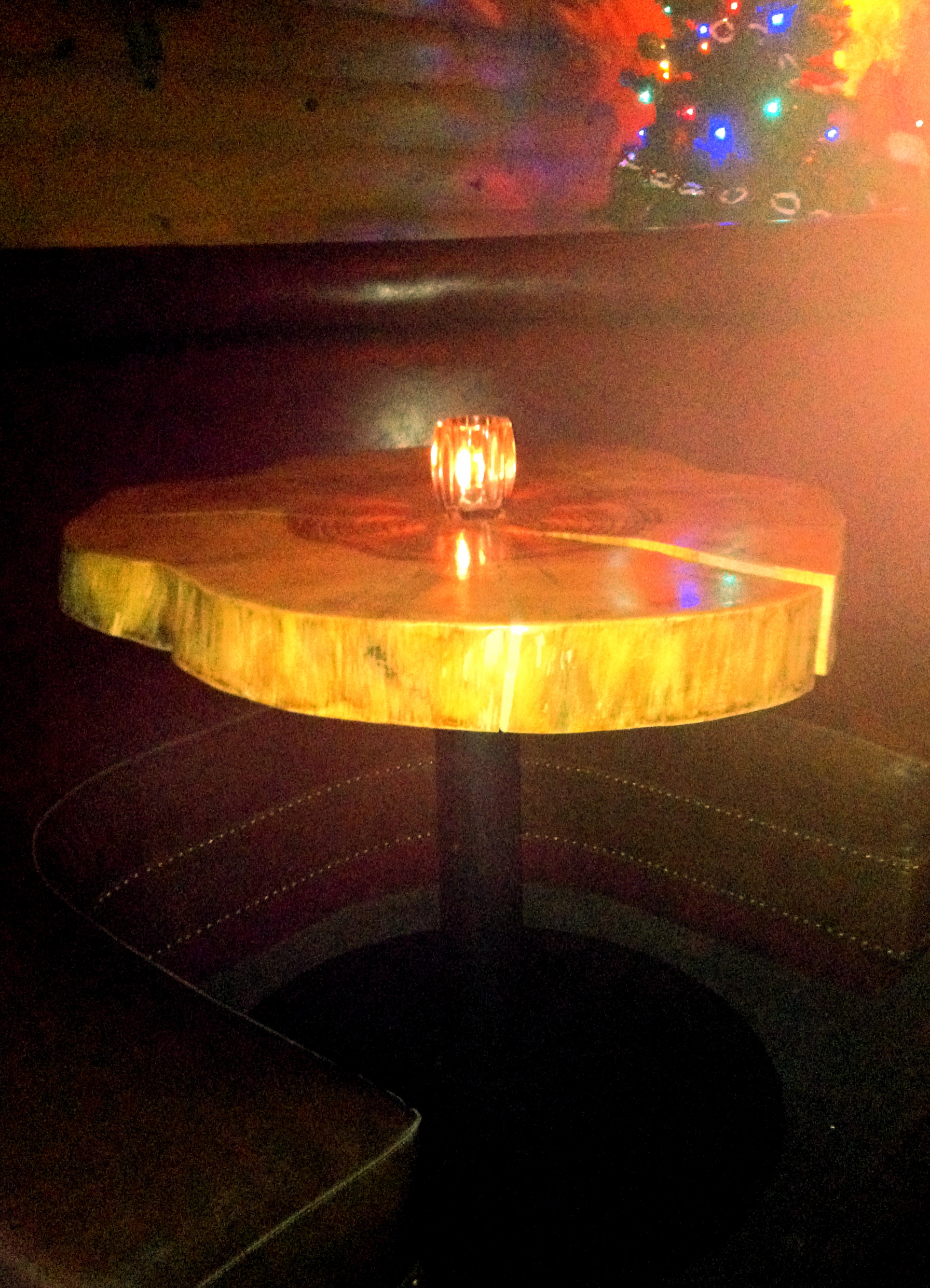 I was looking for a makeshift LA winter, so the vibe was pretty perfect. Tabletops made out of tree stumps, wall-mounted deer heads, Smokey the Bear in a Santa suit… Their chalkboard menu even boasted Moonshine. I don’t know what the 1930s version of the word “baller” is, but having Moonshine on your menu is definitely that.